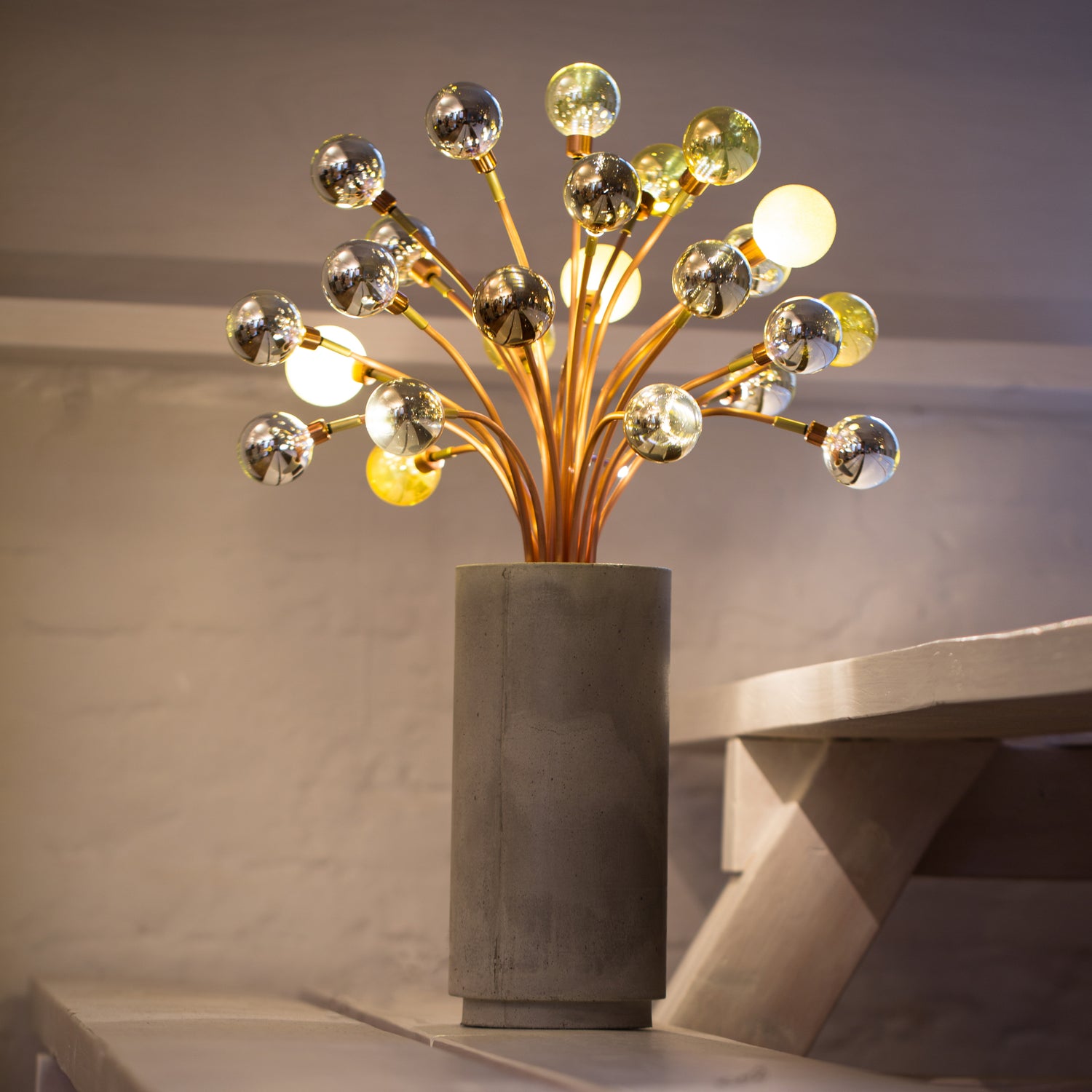 Pictured is the Flower Bomb lamp with a selection of silver and gold crystal and sahara sand bulbs using SMD element.